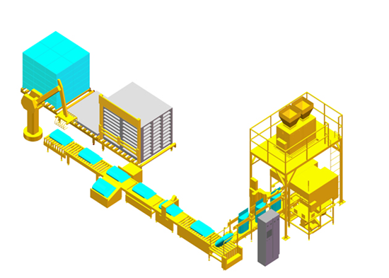 經前面工序檢測合格的產品被輸送至碼垛輸送機,由碼垛機器人按設定好的碼垛方式自動包裝袋搬運到托板上,達到取代人工搬運、節約成本、提高勞動效益的目的。