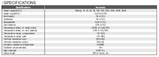 額定量程(R.C.)1tf, 2tf, 3tf, 1kgf, 2kgf, 5kgf, 10kgf, 20kgf, 50kgf, 100kgf, 300kgf, 500kgf