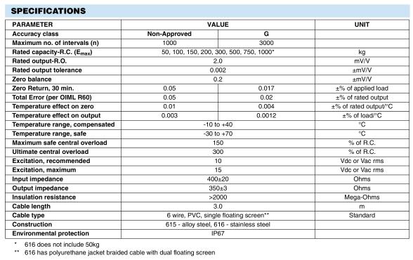 tedea 616-200kg由不銹鋼制成,耐濕度涂料和屏蔽電纜使這些稱重傳感器可以在惡劣的環境中使用,同時保持其操作規范。額外的感應線補償的變化由于溫度變化和/或電纜的引線電阻擴展名。應用機電結合秤、皮帶秤、筒槽計量、測力系統、配料秤、定量系統等。(英譯:Tedea 616-200kg by stainless steel, resistant to moisture coating and shielded cable make these weighing sensor can be used in harsh environment, while maintaining its operation specification. An additional line of induction compensation change due to temperature change and/or the lead resistance of the cable extension. Used mechanical and electrical combination scale, belt scale, cylinder tank metering, load system, batching scale, quantitative system, etc.)