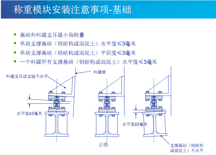 要注意水平調整,包括單個模塊的安裝平面和一套稱重模塊之間的水平調整。