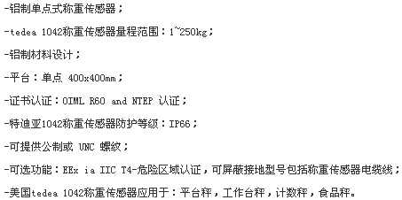 1042-150kg是鋁制單點式稱重傳感器,防護等級IP 66,支撐臺面:400X400mm,廣泛應用于平臺秤,工作臺秤,計數秤,食品秤等多個領域。(1042-150kg of aluminum single point weighing sensor, protection class IP 66, supporting the table: 400 x400mm, widely applied to the platform scale, work platform scales, counting scales, food scales and other fields.)