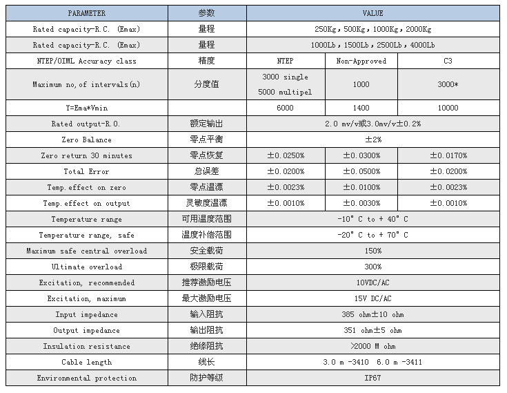 特迪亞3410-2000KG稱重傳感器產品參數表: