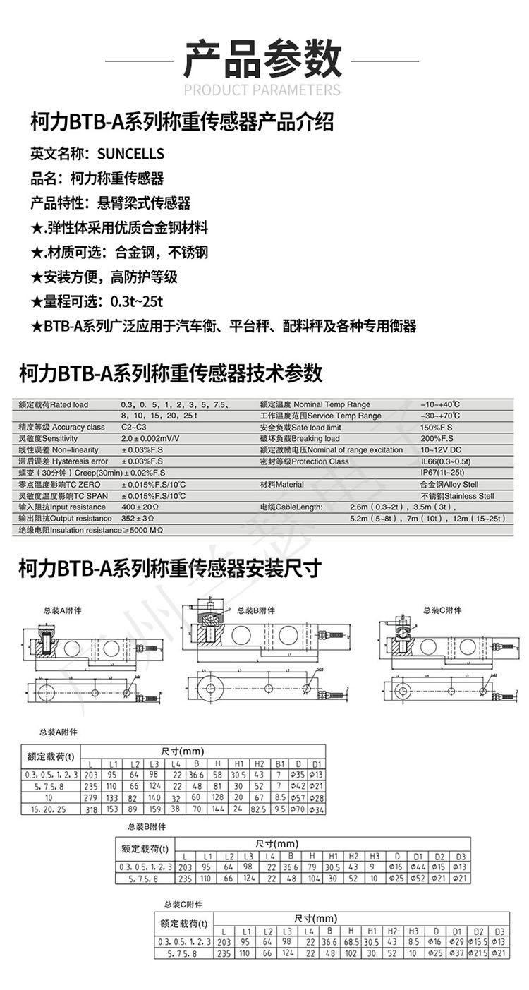 美國SUNCELLS BTB-3T稱重傳感器中文參數:
