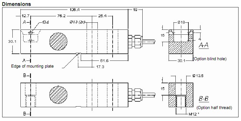 彎梁式稱重傳感器通過線纜一側的兩個緊固鉆孔安裝。而在線纜的另一側,通過通孔或盲孔將力引入,垂直作用于測力傳感器的中軸線。另有一款半螺紋承載孔可供選擇。