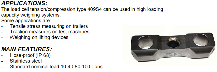 測力傳感器的張力/壓縮類型409S4可以在高負(fù)載容量的稱重系統(tǒng)中使用