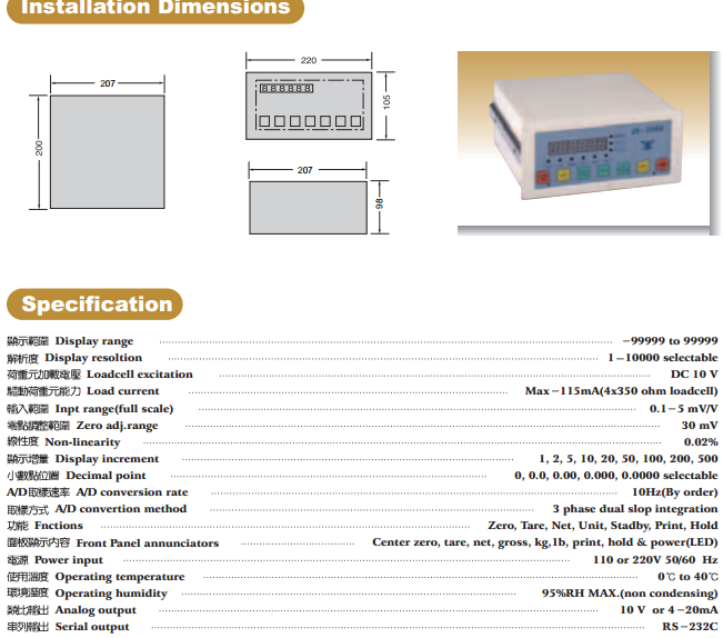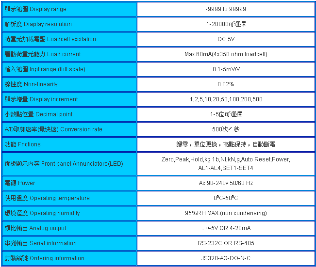 臺(tái)灣JIHSENSE JS-320稱重顯示控制器可標(biāo)配本品牌所有模擬荷重元規(guī)格: