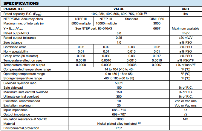 特性Double-Ended Shear Beam Load Cells Sensortronics Model 65058 is trade certified for NTEP Class IIIL:10,000 Divisions; Class III:5,000 Divisions and OIML 3,000 Divisions in 20,000 to 200,000 lb. range and is Factory Mutual System Approved for Classes I, II, III; Divisions 1 and 2; Groups A through G.