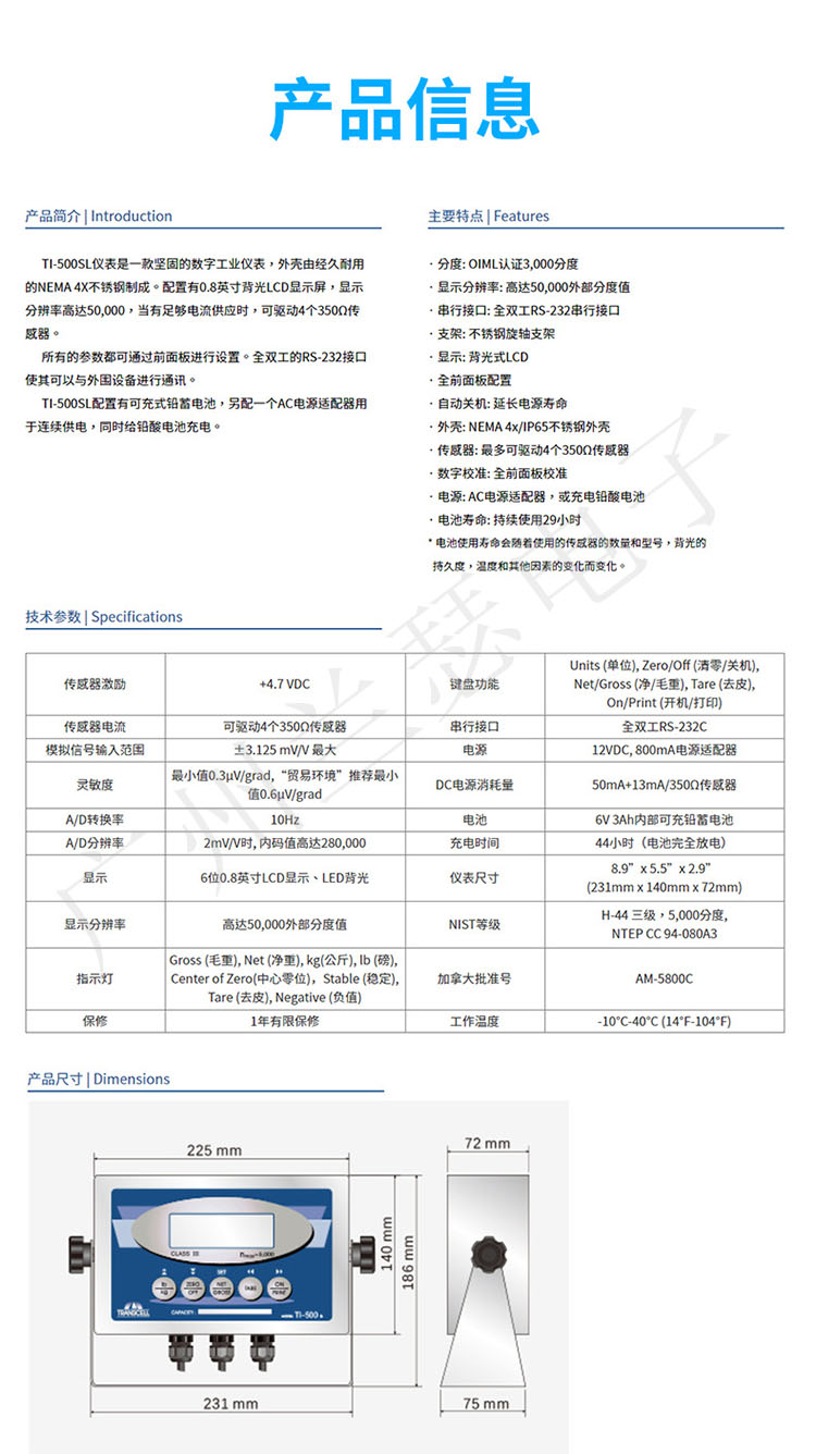 美國(guó)Transcell TI-500SL稱重儀表產(chǎn)品參數(shù):