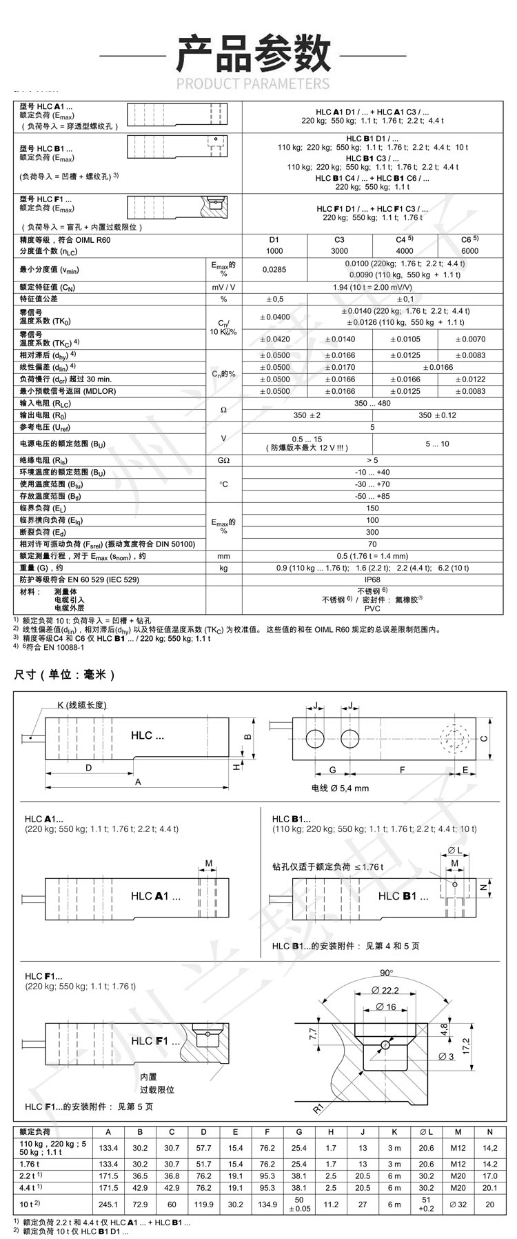德國HBM HLCF1D1/1.76t稱重傳感器尺寸小防爆型號可選,符合 ATEX95 (HLCF1C3,額定負載220 kg / 550 kg / 1.1 t / 1.76 t,符合 EMC/ESD認證,HBM傳感器按照EN 45 501,符合OIML R60 標準,分度最高為3000 d,精度等級D1 / C3。