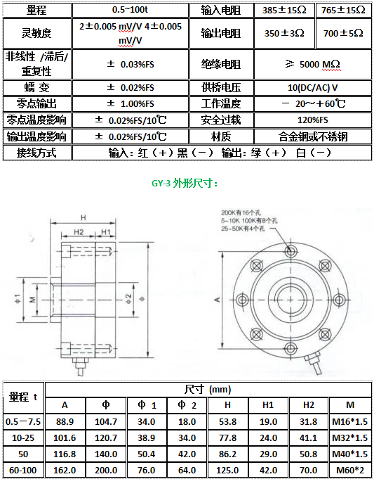 GY-3型輪輻式傳感器,其彈性體采用短而高的剪切梁,剛性特好,抗側向力強,輸出靈敏度可達4mV/V,在結構上具有過載自鎖。防護上采用膠封和焊封,分別達到了IP67和IP68,因此廣泛應用于汽車衡、扎道衡、測力機和吊秤等設備上。產品型號:GY-3,GY-3-0.5T,GY-3-7.5T,GY-3-10T,GY-3-25T,GY-3-50T,GY-3-60T,GY-3-100T