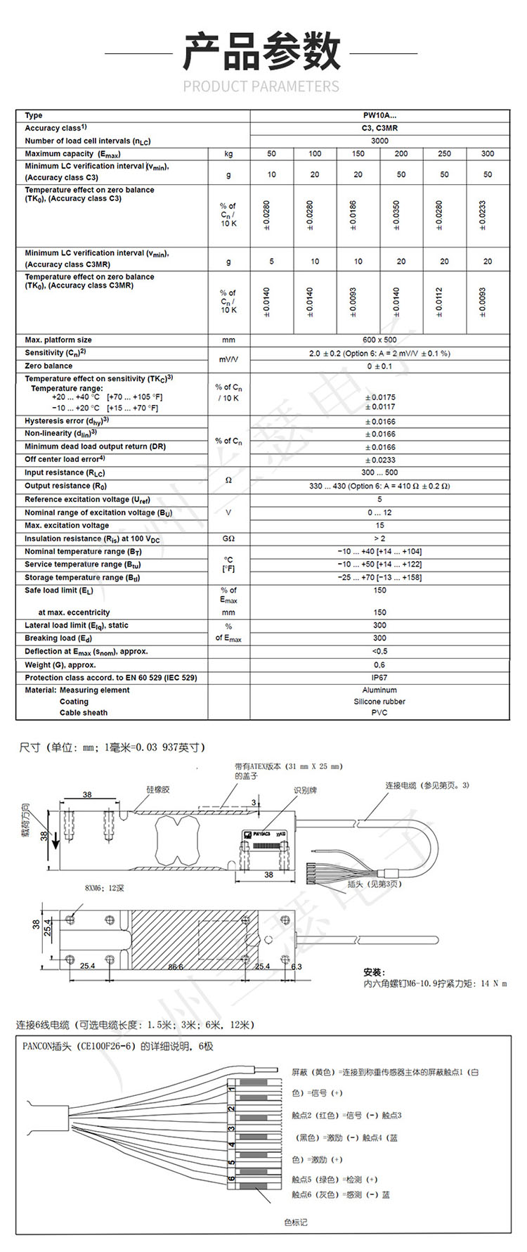 PW10AC3/150KG稱重傳感器最大秤臺面積 600 x 500 mm. 標準電纜為3 m長屏蔽6線電纜; 同樣,我們還提供更長的電纜長度 (最大 12 m), 可調整的輸出或更小的檢定分度(vmin),另外所有的HBM PW10AC3/150KG稱重傳感器都提供防爆型號 (按照 ATEX 95 (Zone 1, 21; Zone 2,22).