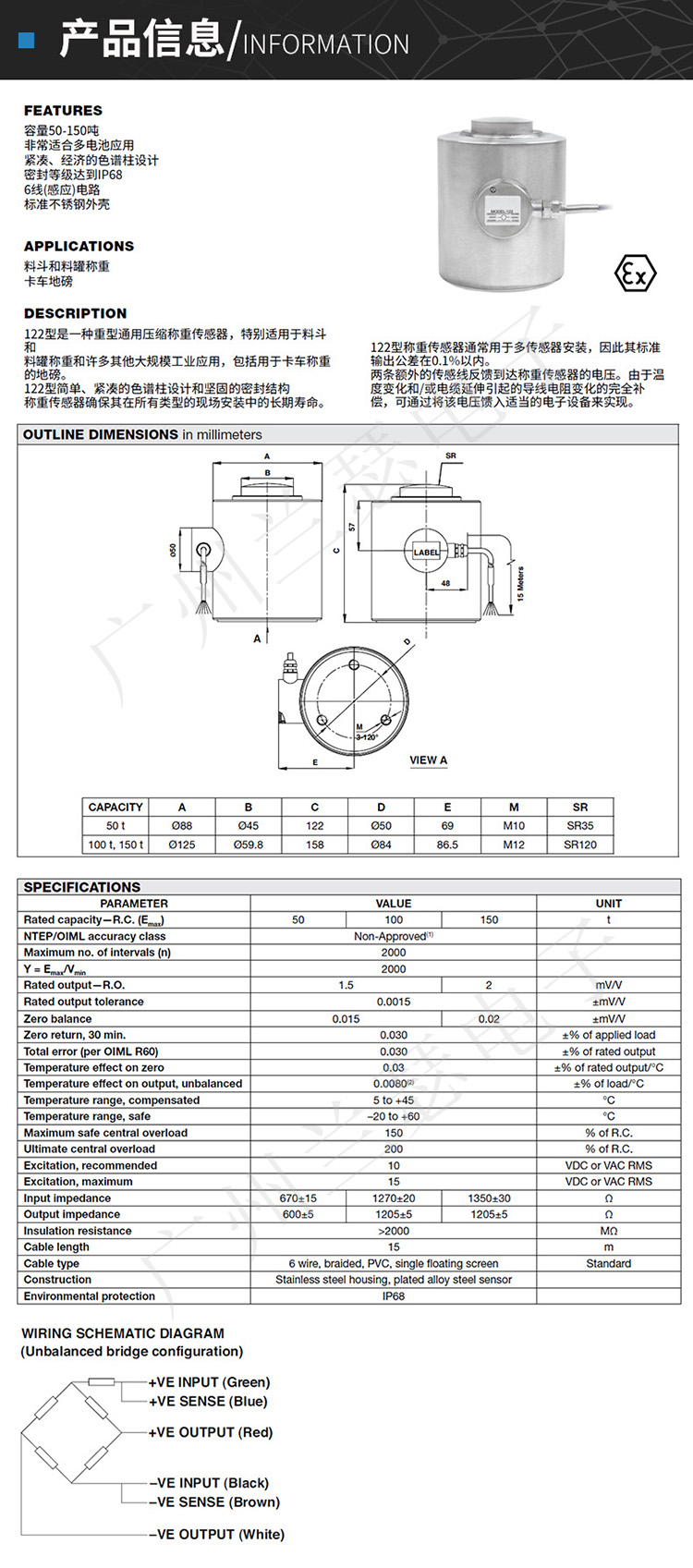 美國Tedea 122稱重傳感器產品參數: