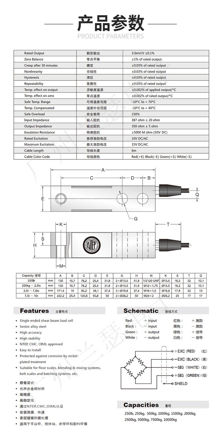 量程:250lb,250kg,500kg,1t,1.5t,2t,2.5t,5t,7.5t,10t