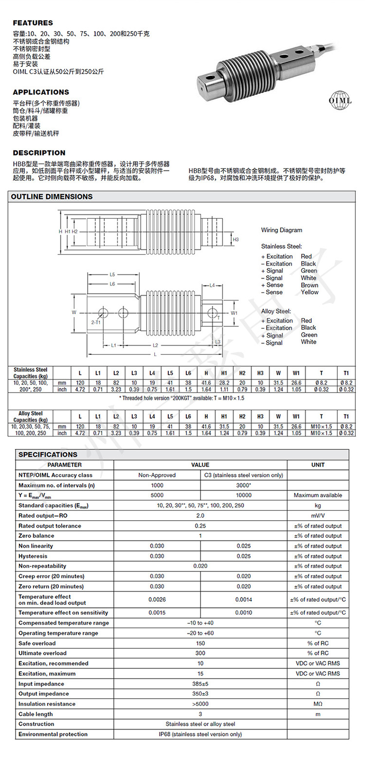 美國Celtron HBB-50kg稱重傳感器產(chǎn)品參數(shù):