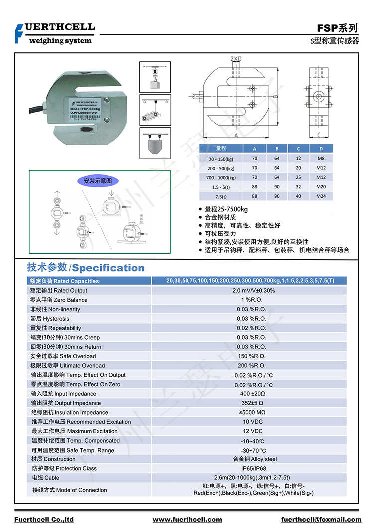 美國FUERTHCELL FSP-500kg稱重傳感器產品參數: