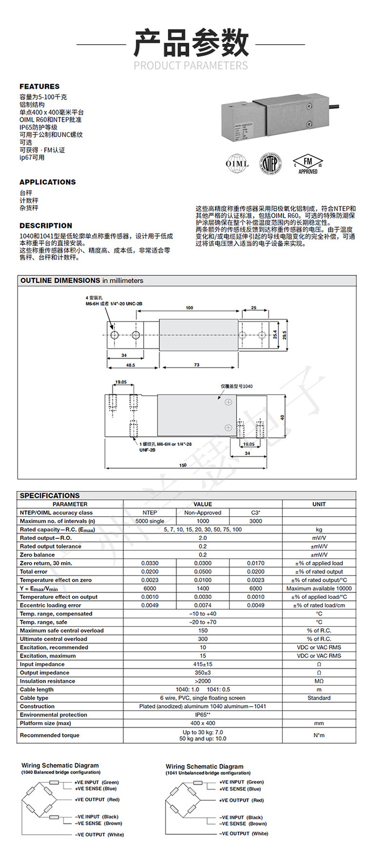美國Tedea 1040-50kg稱重傳感器產品參數: