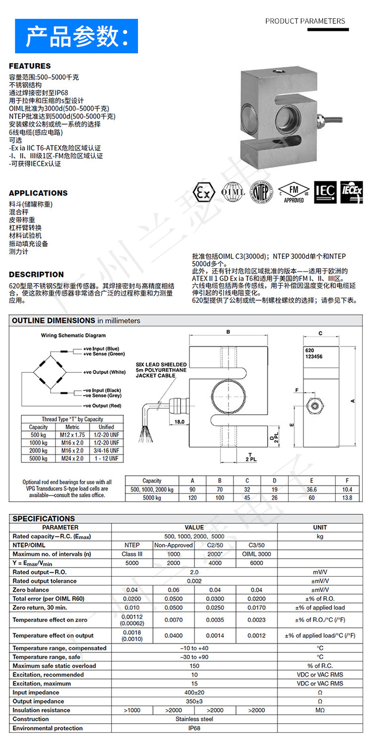 美國(guó)Tedea 620稱重傳感器產(chǎn)品參數(shù):