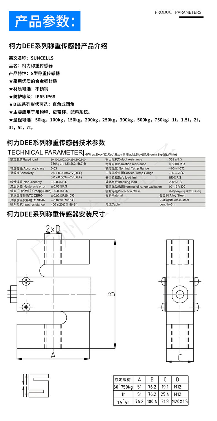 Suncells DEE-250KG傳感器主要特性: