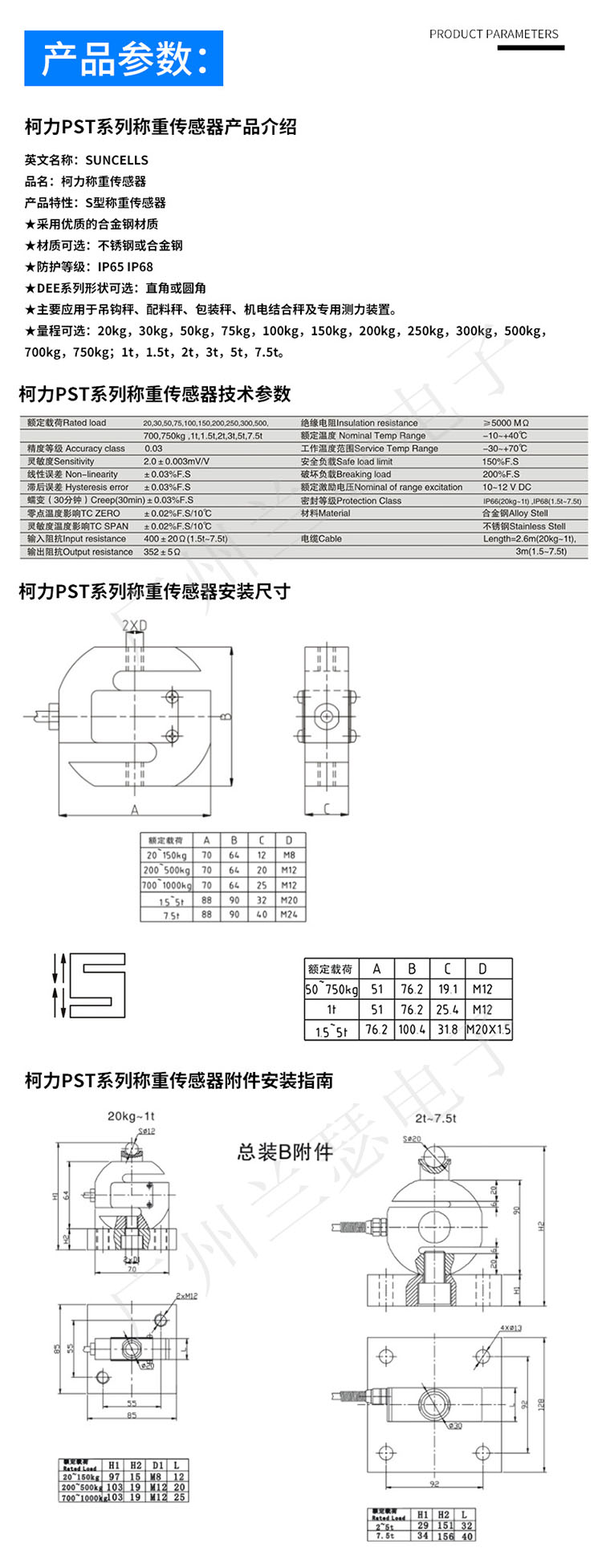 柯力PST稱重傳感器所有量程:
