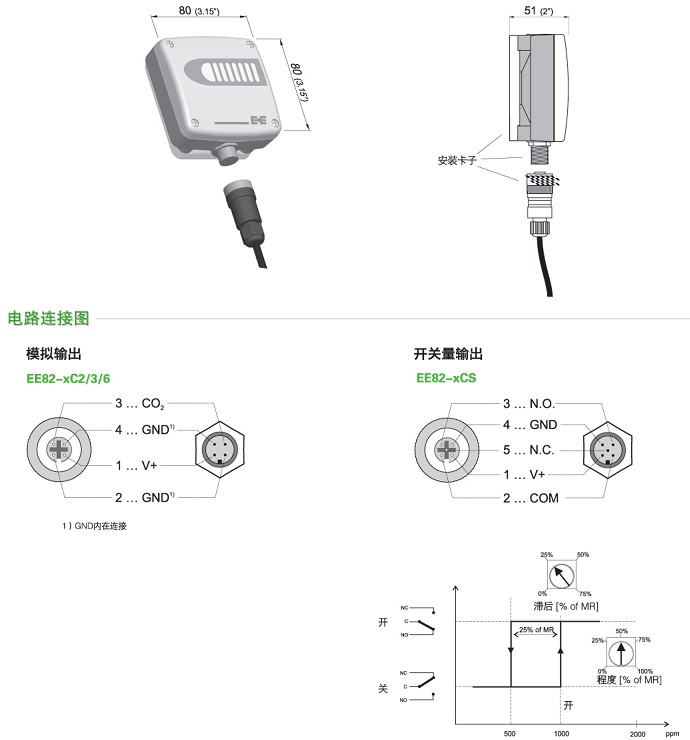 EE82測量范圍為 0...2000 / 5000 / 10000ppm,可選擇0-5/10V或4-20mA的模擬信號輸出,也可以選擇帶有報警設定點和回差設定點的開關信號輸出。使用卡座式安裝法蘭和信號連接插頭,無須打開外殼,就可以方便安裝變送器。