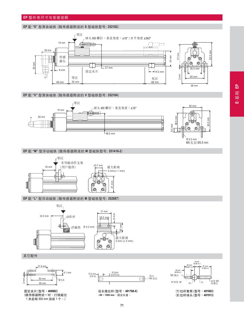 每個 EP 傳感器隨機附送一對固定夾片(型號:400802)作安裝用,在 1200 mm 行程范圍內頭尾裝兩片便足夠,超過 1200 mm 加裝一片,然后每超過 500 mm 再加裝一片。